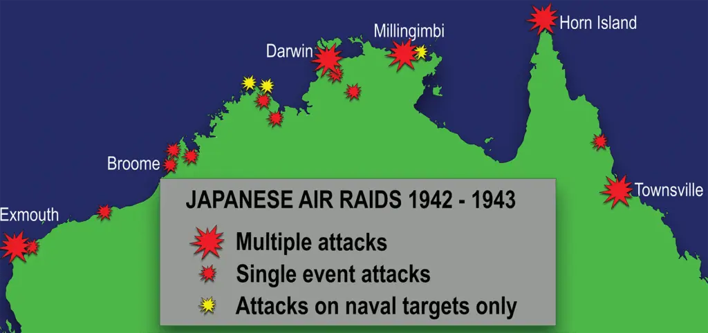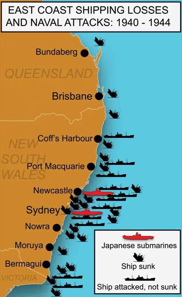 As a loyal dominion within the British Commonwealth, Australia joined Great Britain when it declared war against Nazi Germany in September 1939. For two years, Australia’s military focused its efforts in the Middle East and European theatres, fighting German and Italian forces. Japan’s devastatingly successful attacks in late 1941 and early 1942 against Australian, British, American and Dutch possessions in Asia and the Pacific, brought the war to Australia’s shores. Japanese naval and air attacks occurred in several locations. Numerous merchant ships were sunk in Australian waters by Japanese and German submarines and mines. Australian forces were recalled from the Middle East to help defend against possible invasion and to fight in nearby territories. Australia also became a staging base for a million American and allied military personnel.