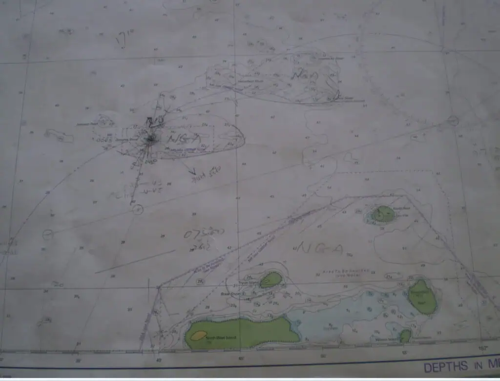 The ship's chart with hand drawings indicating Douglas Shoal and other surrounding shoals and islands as 'NGA' - no go areas.